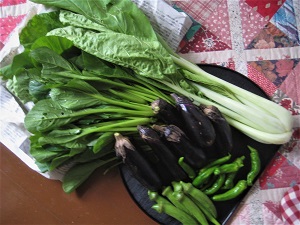 今日の天気は、曇り・小雨・・・ 今朝ikechanがお野菜を届けてくれました。 右上の野菜は、しゃくし菜と言う野菜で さっと湯通しして、軽く塩漬けして お漬物として食べましたが しゃきしゃきしてて美味しかったです。 いつもいつも本当にありがとう〜〜〜 そして今日のパッチワークは 少し丸のマツリして・・・ 明日は「たなばたの会」・・・ 雨、降らないといいなあ〜 それでは、また〜〜〜 JUGEMテーマ:今日のおしゃべり