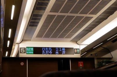 【写真−1 水戸は東京から遠い印象はあるが結構近い】 16時53分に東京駅を発った特急『ひたち21号』の次の停車駅は茨城県の水戸駅で、写真−1は水戸駅に停車中の車内表示。東京駅から1時間14分しかかからず、各駅停車を利用すると所要時間は2時間9分。水戸も特急利用なら東京は完全に通勤圏。 【写真−2 サラリーマン風の人が何人も降りた】 水戸駅を過ぎると停車駅が多くなって、勝田、大甕、常陸多賀と停まり、その次が写真−2の日立駅。日立は日立製作所の企業城下町だが、2011年...