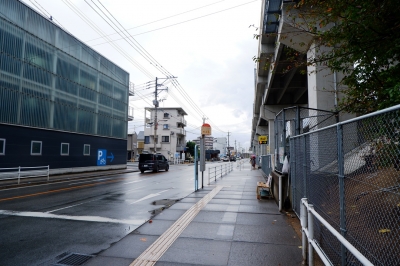 【写真−1 写真で道路は片側2車線と分かるが見た時は狭い道路と思った】 写真−1は博多南駅の改札口を出て階段を下りて目の前を通る道路右側の様子で博多側を見る。工場か倉庫街のような駅前風景だが、右の高架は新幹線路線。左の建物はショッピング・ビルでここから見ているのは建物の裏側になり、表に出れば賑やか。 【写真−2 春日市方面には幅広い車両基地の下を横断する】 写真−2は駅前の左側で、上に黒く写るのは駅からショッピング・ビルへ繋がる通路。この道路を挟んで駅と...
