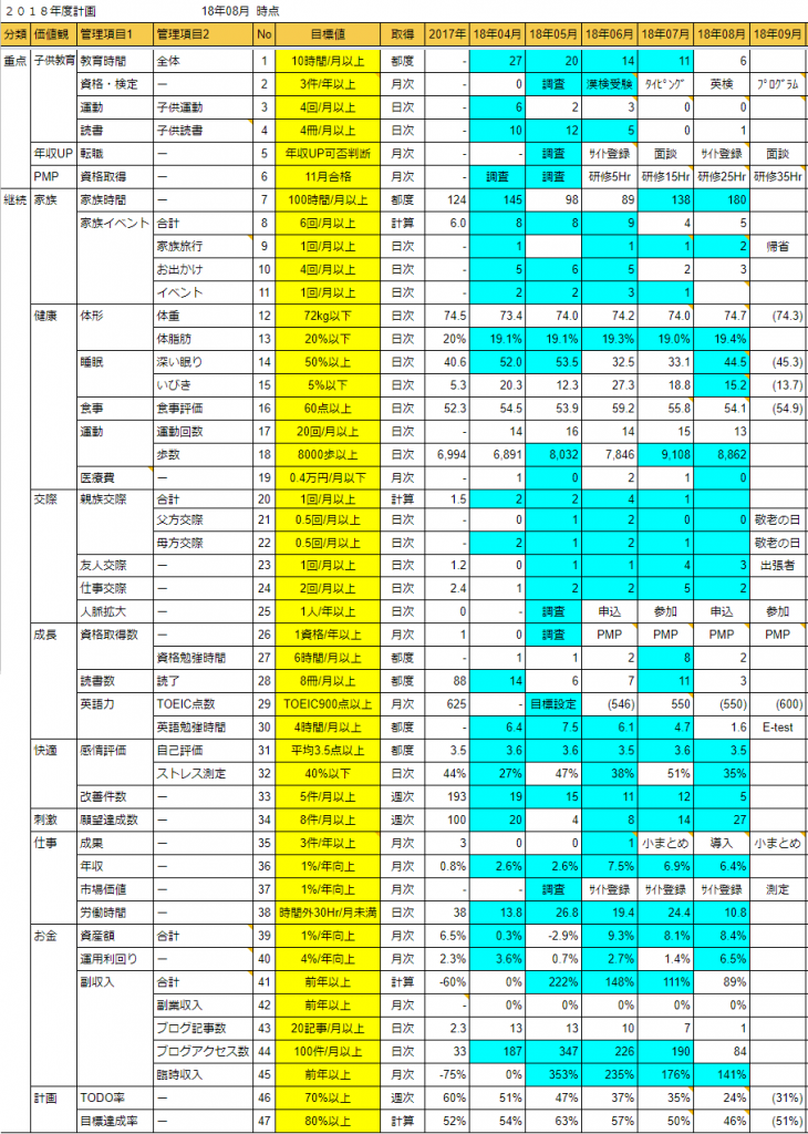 前回の投稿で、「指標を数値化できていない項目がいくつかある」 と言っていますが、今回はその改善です。 具体的には、「子供教育」「年収UP」「資格取得」「人脈拡大」 「市場価値」といった項目です。 例えば、「子供教育」「年収UP」「資格取得」の年度計画は、 上のようになっています。 狭いスペースに言葉で書くだけだと、全体の状況を表現できず、 いい計画、いい管理ができているとは言えません。 そこで、「進捗率」という数値を使って、...