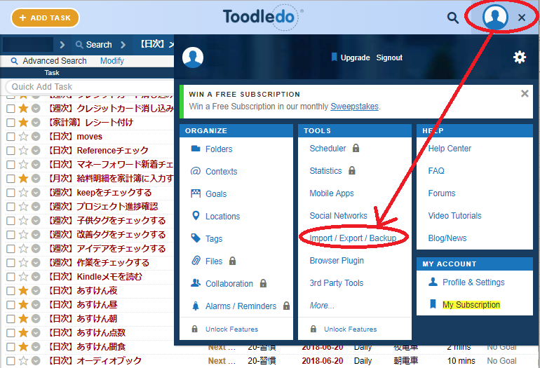 今回は、習慣実施を確認する方法について説明します。 タスク管理ツールのToodledoで完了消し込みをしたタスクは、エクスポート機能でcsv出力をします。 出力したcsvファイルの内容を、エクセルファイルに貼り付けて、習慣別・週別に自動集計します。 例に出しているのはDaily習慣なので、毎日実施する習慣です。縦に習慣を並べて、横に週別の実施回数を並べており、右端には達成率を算出しています。 どの習慣も達成率が低いですね!ちょっと最近...