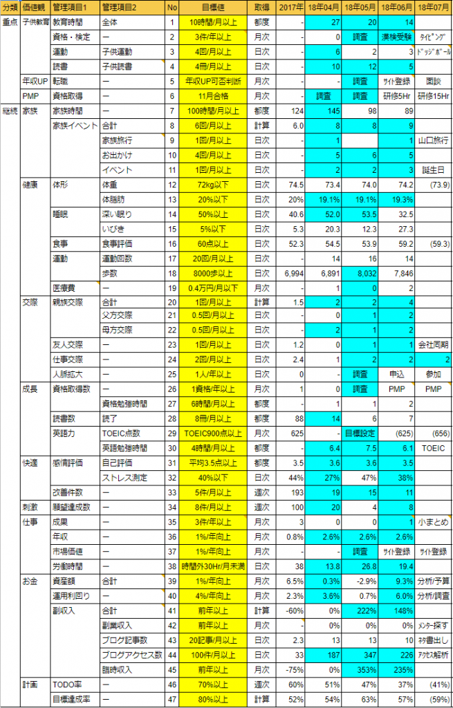 2018年度の年度計画表の6月実績を記入しました。 右から2列目が6月の実績で、目標をクリアしている項目は水色で網掛けしています。 No.47に記載している全体の目標達成率は、46項目中26項目達成の57%。 前月から6%ダウンと達成率が低いです。 今月も、KPT(Keep:よかったこと/Problem:悪かったこと/Try:次に試すこと)で振り返ります。 1.Keep:よかったこと (1)前月のTry項目は全て実施することができた (2)仕事で表彰を受賞 ...