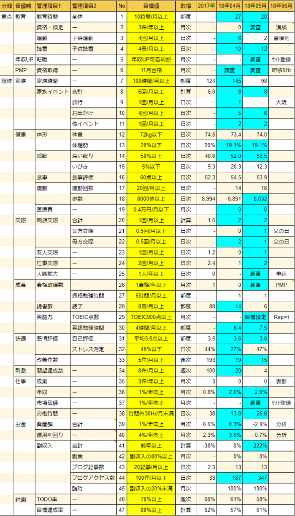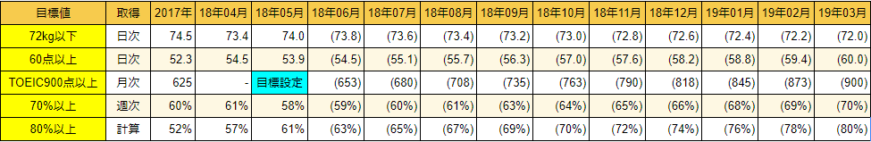 前回の投稿内容の「try項目:次に試すこと」を片付けていきたいと思います。 (1)目標値の見直し(体重、食事評価、TOEIC点数、TODO率、目標達成率) これらは、「Problem:わるかったこと」の、 (1)目標が高すぎる項目がある(体重、食事評価、TOEIC点数、TODO率、目標達成率) を受けたものです。 実際、体重は目標72kgに対して実績74kg、目標60点に対して実績53.9点など、 簡単には埋まらないギャップがあるため、いまいちモチベーションが上がら...