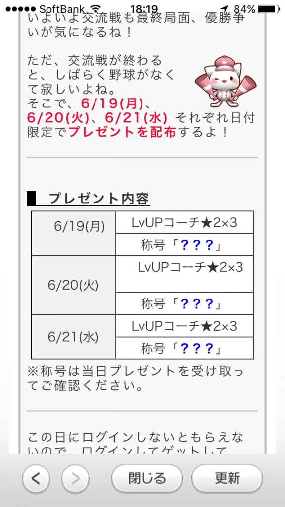 JUGEMテーマ:iPhoneゲームアプリ 今日も好きです プロ野球が好きだ!2017 (by.スクエニ) 交流戦の合間の3日間に LvUPコーチの配布が決定したようです RankUPじゃないのがスクエニ仕様 さて、昨日の試合。原口選手にヒーローインタビューとか いろいろついて プラチナマッチ、一位ゲット。 その分消費したカードの補充が大変そうです ランキングも、自己ベスト更新 うん。逃げ切れないよね。これは さて、交流戦もいよいよ大詰...