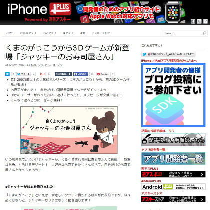 iOS&Android向けアプリ 「ジャッキーのお寿司屋さん - くまのがっこう」が、 iPhonePLUS様より、新着記事として紹介されました! 頑張って作っても、 人様の目に触れなければ意味がないこのアプリ戦国時代で、 このようにご紹介頂けるのは恐悦至極に存じます! iPhonePLUS様は、 週刊アスキー編集部の方々により提供されている、 iPhone/iPad関連のアプリに特化した情報発信サイトです。 iPhonePLUS様、本当に有難う御座います! お時間があれば、ぜひiPhonePLUS様を訪問してみてくださいな。 &n...