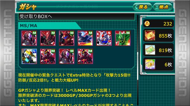 Gジェネフロンティア 緊急クエスト「ファルシア&デファース強襲!」 ポイント制が嫌ですがなんとか折り返し地点まで行きました◝(๑⁺д⁺๑)◞՞ 今まで順調だったFRガシャも今度ばかりは、FRガンダムDX/ツインサテライトキャノン&GXビットのみ。 ガロードさんは引けませんでした(;´༎ຶД༎ຶ`) と言っても片方だけ出ればラッキーなんで、ゴールドガシャ券のムダ使いはやめて来月まで取っておくつもりです♪ フレンドのFRガンダムDXを入れると画面が凄...