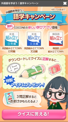 JUGEMテーマ:iPhoneゲームアプリ こんなんやってました。 クイズに答えるとアイテムとガチャ券がもらえるみたいなので、早速やってきました。 身につけるとこんな感じに。 制服系ならなんでもあいそうですね。