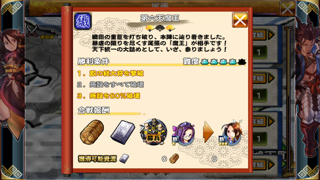 実装されている戦のクエストはこれで一通り、クリア出来た。 扇3つとれてないのが尾張の「第六天魔王」と美濃の「美濃の蝮」の二つのみ。 第六天魔王の戦も同盟に虎御前プレイヤーが来てくれないと扇二つは難しい。 何だかんだ戦国クロスは現仕様だと、同盟プレイヤーが結構、鍵を握っているね。 最近は対戦イベントの影響もあって 対人を積極的にやっているんだけど、銀・米もやっぱり人から奪った方が効率よく稼げる。 銀・米を施設強化に必要な分だけ稼いで、強化開始してから放置プレイって感じ。 課金もしてい...