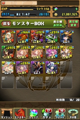 JUGEMテーマ:パズドラ 曲芸士とか赤おでんみたいな、 このBOXで活用しきれないモンスターは売った。 アテナの後釜としてカンナを置く。 念のためアヌビス用にハクを残してあるけど、追加で闇カーリーを引けたら捨てる。 麒麟は覚醒の詳細発表待ち。 明日だったかな。 今はイシスにスサノオを食わせてもいいか、プロに指示を仰いでるところ。