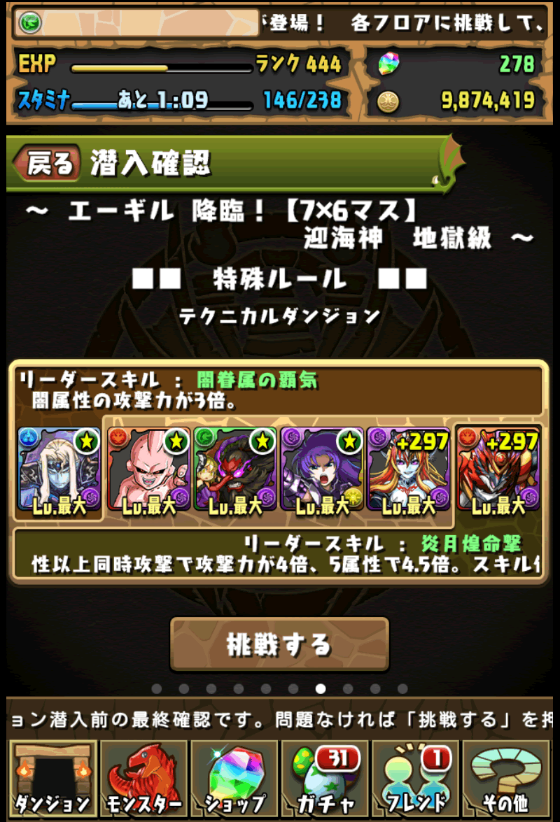 JUGEMテーマ:パズドラ 攻略パーティー 昨日初降臨のエーギル降臨 迎海神 地獄級に、デューク×覚醒ホルスパーティーで攻略です。 悪魔タイプで封印耐性を100%で編成します。 天狗のスキルは使わないのでスキルレベルは1でも良いですが、これ以外はスキルマ推奨です。 基本的な流れは、バトル1と2を適当に倒し、バトル3を攻撃態勢、バトル4を適当に倒し、バトル5をシールド切れてから一気に倒し、最後はギガグラビティからアナザーディメンションで倒す感じです。 合計コスト:205...