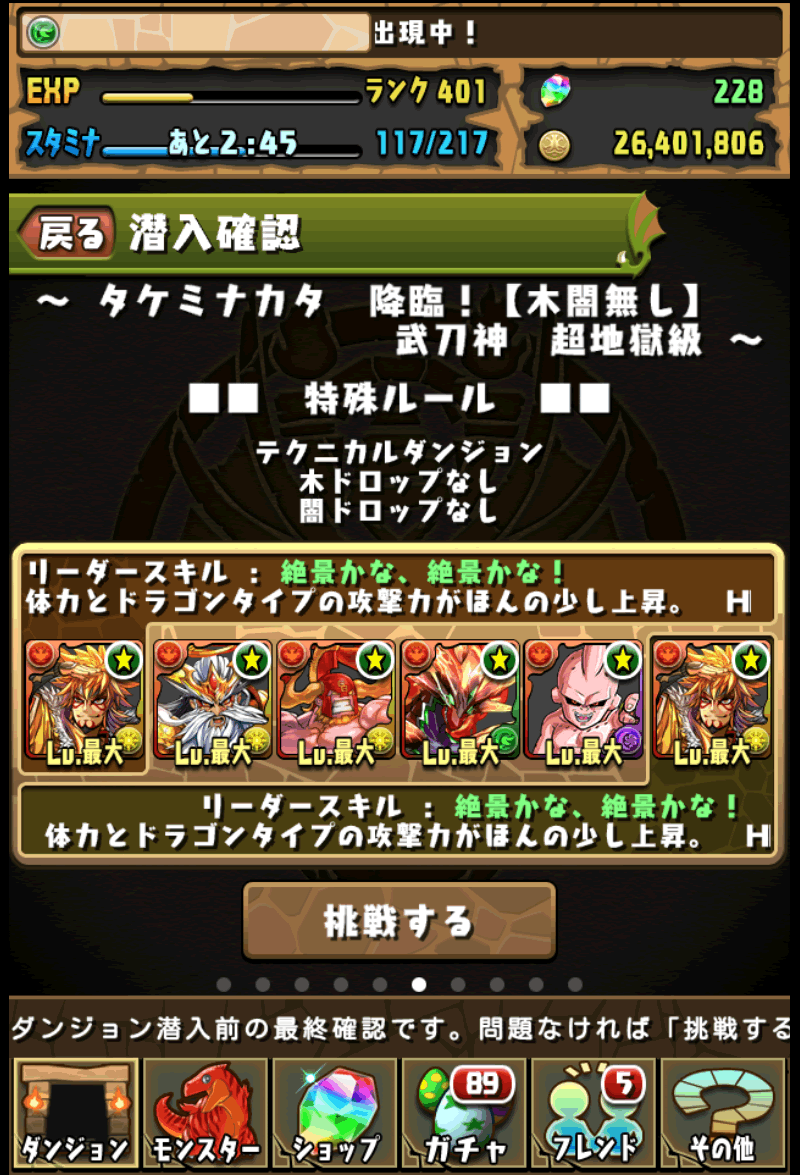 JUGEMテーマ:パズドラ 攻略パーティー タケミナカタ降臨超地獄級に、究極五右衛門パーティーで攻略です。 攻撃態勢をスキルマにして、スキルブースト5個以上で編成します。 先制攻撃が多いので、回復ドロップ変換がいると安全です。 HPは25,561以上必須で、五右衛門はスキルマ推奨です。 基本的には、バトル1をワンパン、バトル2でスキル貯め、バトル3を適当に倒し、バトル4を花火、最後も花火で倒す感じです。 L:天下御免の大泥棒・石川五右衛門 【Lv.最大 SLv.最大 覚醒 ★ +0】 S1:覚醒ゼウ...