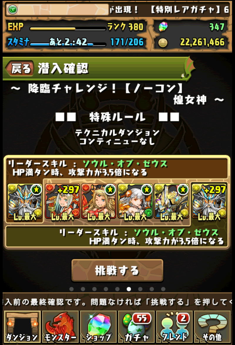 JUGEMテーマ:パズドラ 今回のパーティー アテナ降臨超地獄級に、超覚醒ゼウス12.25倍パーティーで攻略です。 威嚇があると安全です。 ラースオブゴッドのスキルがあまり上がってない場合は、防御態勢を1体編成するとスキルが貯めやすいです。 基本的な流れは、バトル毎に体力を全回復してくれるので、攻撃を食らう前に倒す感じです。 L:超覚醒ゼウス 【Lv.最大 SLv.最大 覚醒 ★ +0】 S1:紅蓮華の女傑・エキドナ 【Lv.最大 SLv.最大 覚醒 ★ +297】 S2:紅蓮の女傑・エキドナ 【Lv.最...