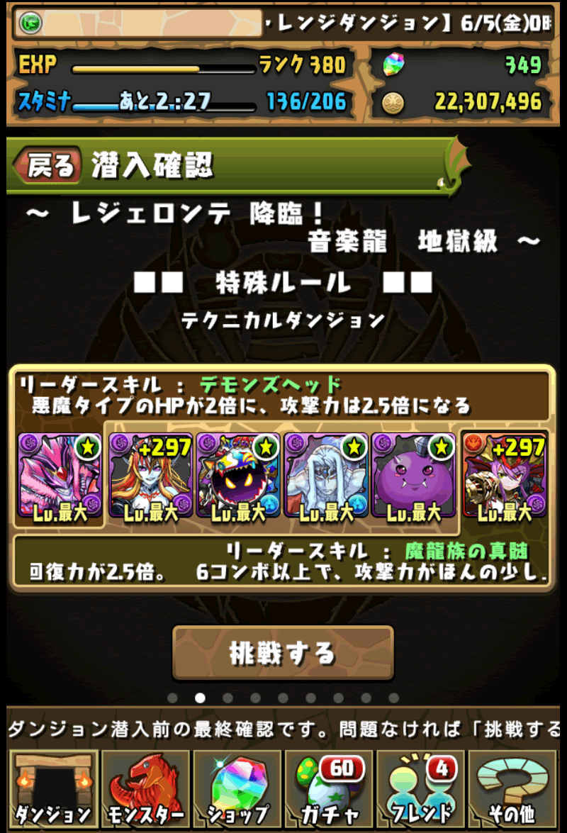 JUGEMテーマ:パズドラ 今回のパーティー 本日初降臨のレジェロンテ降臨地獄に、ベルゼブブ×赤ソニアパーティーで攻略です。 最後のボスの体力が450万くらいあるので、ワンパンするのにギガグラビティと悪魔エンハンスを編成します。 殴り合うのが多いので、回復力高めが良いです。 基本的な流れは、バトル1を殴り合い、バトル2を陣、バトル3をギガグラビティから殴り合い、バトル4を殴り合い、最後はギガグラビティから陣で倒す感じです。 L:獄羅苦狂魔皇・ベルゼブブ 【Lv.最大 SLv.最大 覚...