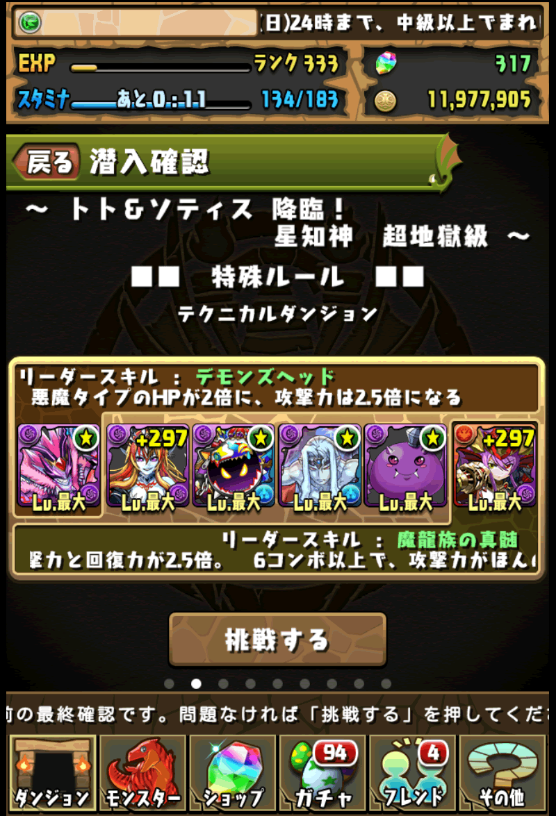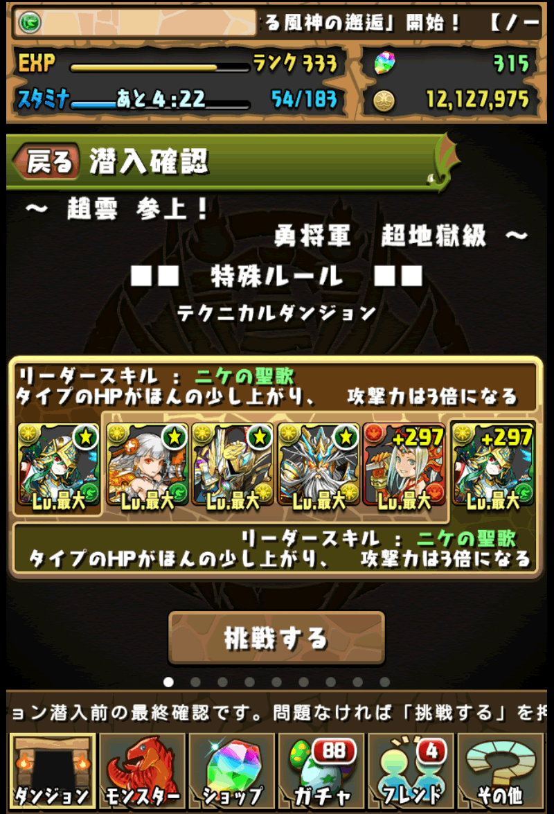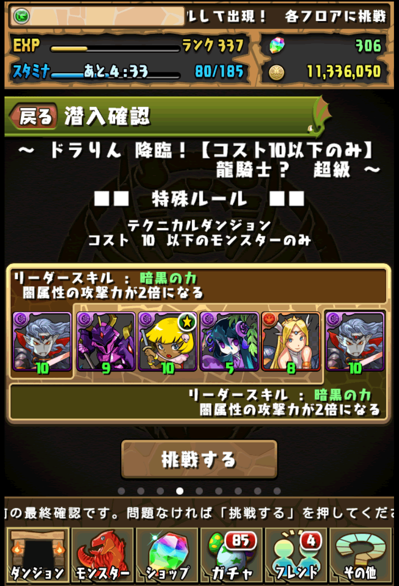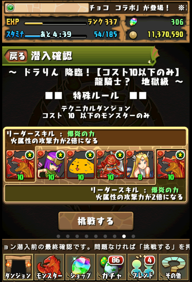 チャレンジダンジョン!Lv8 回復なしです。潜入してきました。前の週のチャレンジダンジョンですが、今週にも適用できそうです。
