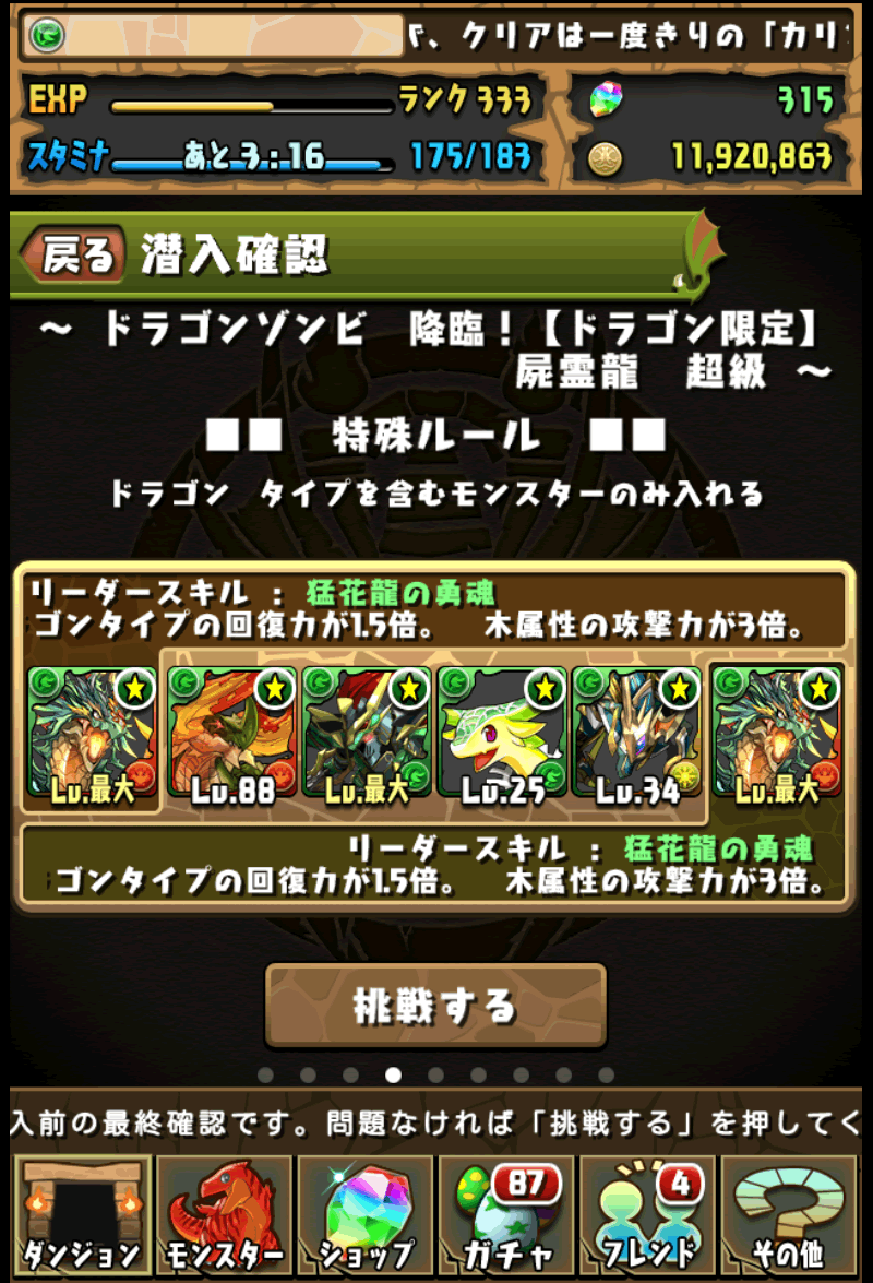 JUGEMテーマ:パズドラ 今回のパーティー L:猛花龍・ハウルブラキオス 【Lv.最大 SLv.最大 覚醒 ★ +0】 S1:ジェネレイトアースドラゴン 【Lv.88 SLv.最大 覚醒 ★ +0】 S2:エンシェントドラゴンナイト・セロ 【Lv.最大 SLv.最大 覚醒 ★ +0】 S3:碧天の果実・メロンドラゴン 【Lv.25 SLv.1 覚醒 ★ +0】 S4:五機龍合体・ゴッドカノープス 【Lv.34 SLv.3 覚醒 ★ +0】 F:猛花龍・ハウルブラキオス 【Lv.最大 SLv.最大 覚醒 ★ +0】 木のドラゴン攻撃9倍回復2.25倍パーティ...