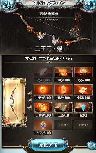 JUGEMテーマ:グランブルーファンタジー 四象報酬で貰ったSSR武器を4本投入してとりあえず「二王弓」のスキルLvを10にし 属性は少し考えたのですが、 素材のあまり具合と コロ杖方陣のせいでステの低さが弱点となる"火属性"にすることとした。 まぁ現状、「サイドワインダー」も「侍」も メインで使って行く事はほぼ無いのでどれに変更しても・・・という感じですが。 ヒヒイロは交換したが微妙に足りてないアイテムがあり。 来週碧空が...