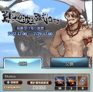 JUGEMテーマ:グランブルーファンタジー 今日の夜から日本を離れるため、先に書いておく。 次の更新は早くて7/20(水)になる予定です。 以下「薫風、白波を蹴立てる」基本スペック ※ネタバレあり ・薫風、白波を蹴立てる(復刻) ・期間:7/15 19:00-7/22 17:00 ※時間は予想 ・プレイ時ランク:- ・シナリオ評価:2(低1〜5高) これも自分としては2回目になる。 敵が単なる「魚」という事で笑わせてもらった。 イベントのシナリオ的には人気があるようで...