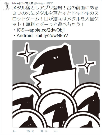 iOS&Android向けアプリ「メダルおとし - LAIMO」が、 LAIMO公式Twitter様より、 おすすめアプリとして紹介されました! 頑張って作っても、 人様の目に触れなければ意味がないこのアプリ戦国時代で、 このようにご紹介頂けるのは恐悦至極に存じます! また、多くのリツイートならびに「いいね」を頂きまして、 誠に、誠に、誠に有難うございます! ここで頂ける「いいね」は格別ですね! 本当に有難うございます! これからも、 「メダルおとし - LAIMO」を よろしくお願...