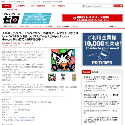 iOS&Android向けアプリ 「なぞけし - ベベダヤン 脳トレパズルゲーム」が、 株式会社アイモバイル様より、プレスリリースとして紹介されました! 既に幾つかの情報発信サイト様に掲載されているようです! 今回は、その中から「プレスリリースゼロ」様の記事イメージをお借りしました! → プレスリリースゼロ - 掲載ページ → 電話帳ナビ - 掲載ページ → AEROPRES(エアロプレス) - 掲載ページ → PRERELE - 掲載ページ → OpenPress(オープンプレス) - 掲載...