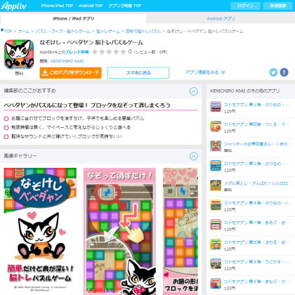 iOS&Android向けアプリ 「なぞけし - ベベダヤン 脳トレパズルゲーム」が、 Appliv様より、新着レビューとして紹介されました! 頑張って作っても、 人様の目に触れなければ意味がないこのアプリ戦国時代で、 このようにご紹介頂けるのは恐悦至極に存じます! 今回も、実際に編集部の方にプレイして頂き、 操作のコツを含めて、分かり易いご解説を頂きました! 少しお話は変わりますが、Appliv様って凄いですね。 私がAndroid界に手を広げて一般向けゲームを作り始め、 今作の『なぞけし』で3作品目に...