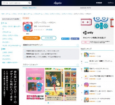 Appliv様より、 iOS&Android向けアプリ「ジグソーパズル - ペネロペ」を、 新着レビューとしてご紹介頂きました! アプリの特徴や遊び方など、分かり易くご紹介頂いております! Appliv様はユーザーさんが手軽にレビューできる事でも有名ですので、 ただアプリの情報を探すだけではなく、 実際に使用されている様々なユーザーさんの生声が聞ける貴重な場でもあります! また、Appliv様ではジャンル別のランキングをご用意されている様で、 今回は「パズルゲーム」として、 「ジ...