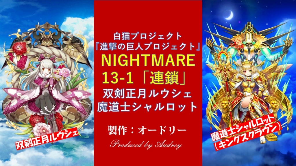 JUGEMテーマ:白猫プロジェクト 進撃の巨人コラボ、超大型巨人 白猫プロジェクト『進撃の巨人プロジェクト』NIGHTMARE13-1「連鎖」のクリア動画をアップしました。 YouTube動画はこちら https://www.youtube.com/watch?v=uLj1d4L5Zx4 ボス面までたどり着くのに道のりが長いので、巨人達に捕まえられないように気を付けましょう。メタルコボルトは無限湧きなので注意が必要です。ルーンバリスタを撃つにはSPが必要なので工夫しましょう。私は魔道士シャルのスキルでライダスをおとりにして、ルーンバリスタを撃ちまし...