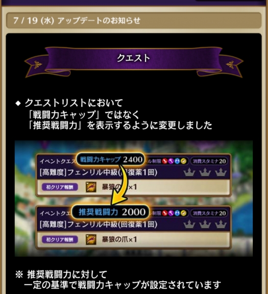JUGEMテーマ:ケータイゲーム こんばんは。つかっぱです。 7/19のアップデートで 戦闘力キャップ→推奨戦闘力に 表示が変更になりました! どれくらいで挑めばいいのかが わかりやすくていいですよね! ◆推奨戦闘力について しかーし!戦闘力キャップが なくなったわけではないんです! ◆戦闘力キャップについて とりあえず戦闘力(ステータス)が 設定された数値まで下がるってことですね! ※パラメータの比率は保たれるようです。  ...