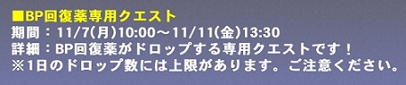 JUGEMテーマ:ケータイゲーム オルサガは今、第6回統一戦が行われています。 そして今回注目なのがBP回復薬専用クエスト! これまでは曜日クエストでの ドロップ率2倍が定番でしたが、 このドロップ率2倍はなくなってしまいました。 BP回復薬専用クエストの特徴としては、 獲得数に上限はあるものの 回復薬のみがドロップするクエストになっています。 消費APはそれなりに大きいですが ...