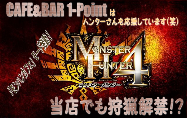 JUGEMテーマ:モンスターハンター4【3DS】 はいっ!(^-^)/ 店長のMakoichiです。 みなさんモンハン4やってますか〜? 私も日々せっせと素材集めに勤しんでいますw 2ndの頃からずっと弓使い一筋です(^^;) PSP以降初めてのモンハンだったので操作に慣れるのに苦労しましたね…。 そして現在HR4、装備も徐々に充実してきました♪ さて、そんなモンハン4ですが…。 CAFE&BAR 1-Pointでもプレイ可能です。 当店は通常営業時でも携帯ゲームで遊んでもOKなんです! あ、もちろん3DSとか持ち込みでって事ですよ?(レンタル...