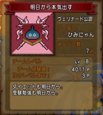 JUGEMテーマ:ドラクエ10 ドラゴンクエストX少し前に作成しました。一人掲示板から申請送ってくれた方で、それ以外は旦那と私のキャラで構成されています。キャラのLV上げよりチームのLV上げに夢中になっている今日この頃です(*´∀`*)メンバー募集は一応出していますが、積極的には行ってません。しようかなーと思うと、明日でいいよねってなるためですァ '`,、'`,、('∀`) '`,、'`,、