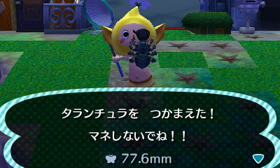 JUGEMテーマ:とびだせ どうぶつの森【3DS】 前回にひきつづき、 8月までの捕獲物語。 ライギョはまだしも、 このタランチュラは6月から出現してて それはそれは大いに 深夜のTLを恐怖で埋めつくておりました。 悲鳴、叫び、助けを求める声、 バタリと地面に突っ伏す村長達の姿・・・ あのころのTLは まさに地獄絵図でしたね。 □_:('Θ' 」 ∠):_プルプルプル 私もスマホを持つ手が震えましたよ。 ・・・と、 まぁそれは言いすぎなんですが (無駄に行を使うなよ) とにかく、多くの村長が網を構え タラ...