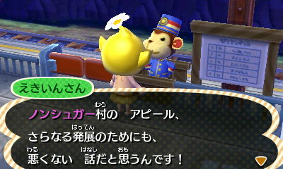 JUGEMテーマ:とびだせ どうぶつの森【3DS】 息子っちが何故か 深夜1時になっても寝てくれなかった ある日のこと。 フレンドさんに美術品を 譲るべく開門しようとしたとこと、 駅員さんが話しかけてくるではありませんか! ・・・ま さ か ! '(<◉>◞౪◟<◉>)' えぇ、そのまさかでしたよ。 サル「どうかしましたッキャ?」 村長「い、いや…大丈夫。提案ありがとう」 ・・・嘘です。 大丈夫じゃありません。