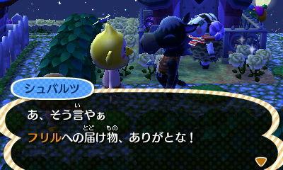 JUGEMテーマ:とびだせ どうぶつの森【3DS】 フリルさんを旅立たせると 自分で決めたこととはいえ とってもさみしい村長です、こんばんは… それにしても フリルたんとシュバ様 妙に仲良しなのよね。 よくプレゼントを贈りあうし、 シュバ様はフリルたんの家の周りに 落とし穴がないかいつも巡回してあげてたし。 ・・・。 え? フリルたんを送り出すのは 嫉妬からじゃないですよ!(`・ω・´) ・・・た、多分ね(ヲイ 以下、二人の会話一部始終なんで ネタバレ見たくない方は 読み進めないでくださいね!