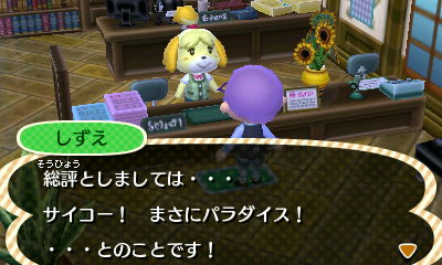 JUGEMテーマ:とびだせ どうぶつの森【3DS】 物を片づけただけで、村がサイコー!になりました。 あっれー? このまま維持。金のじょうろと、すずらんが生えるのを待ちます。 花つめないほうが、花壇活かせると気付いたので、あまり歩かない、芝生があるところでさっそく花壇を建てる。 うーん、このシンプルさが、いいですなー。 ゲンジが座ってくれたので、さっそく隣に座ってみました。 まだ日が浅いゆえか、にこりともしない。うれしいはずなのに、どうしてこうも気まずい感じになっている...