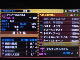 スポンサードリンク こんにちは!みなさん進み具合いかがでしょうか。わたくしこつこつと進めております。中々遅めの攻略ですが今回はネタバレになってしまうかもしれませんが、ネタバレ無理な人見ないでね。G級のラスト攻略後に派生するクエストで錆びたクシャルダオラ登場です!そのヘビィボウガンが攻撃力ぶっとびです!デルフ=エルダオル レア10【必要素材】錆鋼の龍殻 x8錆鋼の龍爪 x4銀嶺の冠 x3古龍の大宝玉 x1攻撃力 540会心 -50%装填速度 やや速い反動 中素材がそろえば直接生産可能です。銀嶺の冠が出に...
