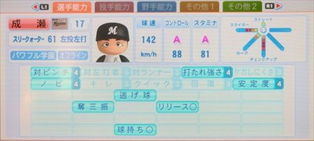 パワプロ2013 成瀬善久 パスワード 選手名 成瀬 利き腕 左投左打 投球フォーム スリークォーター61 身長 180cm 守備位置 投 球団 千葉ロッテマリーンズ 学歴 高校卒 バット色 黒/木 グローブ色 黒 リストバンド左右色 無/無 背番号 17 生年月日 1985/10/13 再現年数 2007年 勝敗 16勝1敗 防御率 1.81 奪三振 173 参考資料 パワプロデータ wiki TOPページに戻る JUGEMテーマ:パワプロ2013