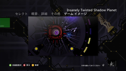 JUGEMテーマ:Xbox 360全般 ゴールド無料でダウンロードした「Insanely Twisted:SP」を最後までプレイ。 正確なタイトルはSP部分が「Shadow Planet」だけど、長すぎるからか、ダッシュボードのタイトル一覧ではSPになってるようだ。 お試しでプレイしたとき購入しようかと思ったくらいなので、いわゆるメトロイドな装備を得て動ける範囲が広がっていく面白さは合格点。 ただ中盤以降のボス戦と一部仕掛けが細かい操作を要求される忍耐との勝負になっているのが不満点。 画面や全体の雰囲気が良いのに、イライラさせる仕掛け...