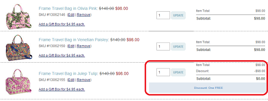 JUGEMテーマ:オシャレ大好き☆最新セール情報! 数多くあるヴェラブラッドリー(アメリカ)のプロモーション セール内容も$20オフなどわかりやすいセールもある中、 3個目無料なんてよくわからないセールも短期間で開催されます。 3個目が無料になっていますよね? 画像が小さいですがDiscount One Freeと確認できるはずです。 $98.00が無料だとは嬉しいです♪ 画像が小さいので拡大したのがコレ しかし、この商品の他に購入しようと金額の低めの商品をカートに入れると・・・ 無料が最安...