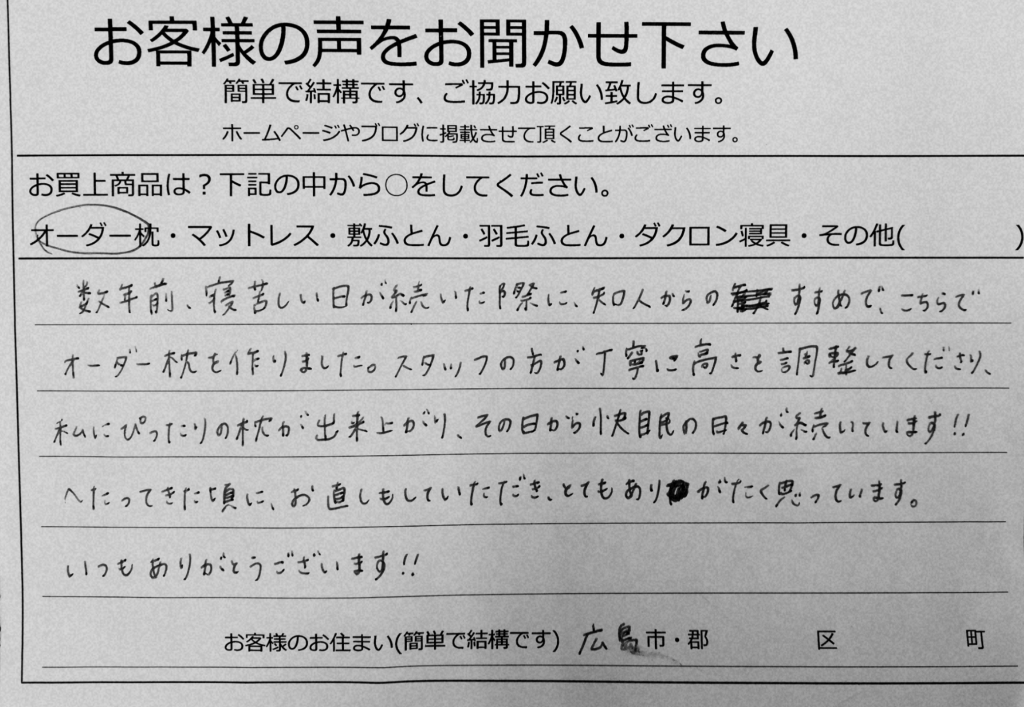 JUGEMテーマ:オーダーメイド枕 JUGEMテーマ:オーダーメイド いつもかわの寝具青崎店のブログを見ていただき ありがとうございます。 広島市西区にお住まいのお客さまが オーダーメイドまくらを作りに来られました。 あまり寝具のことは気にせずにいたけれど からだのあちこちに不調が出てきて ぐっすり眠ることができず、つらいので 枕から変えてみようと思って 来られたそうです。 ご本人様のお話では 横...