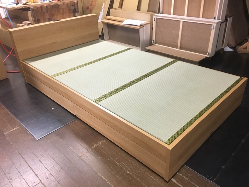 皆様こんにちは。 営業生産部の鈴木でございます。 今回はとあるお客様からご注文をいただき某スポーツ施設の寮向けのベッドの製造をさせて頂きました。 ベッドは宮付きでに頭元にちょっとした棚があり小物を置くのに便利です。 コンセント口もついておりますので、携帯電話の充電などすることが可能です。 抽斗も付いて収納力も抜群です。 仕様は畳タイプで布団を敷いて使用していただきます。 用途に応じて特注ベッ...