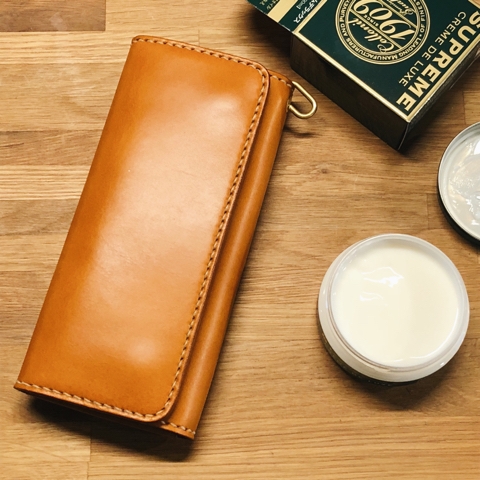 先ほど完成したガゼットウォレットのキャメル。 仕上げにコロニルオイルを塗って、本日発送の準備を進めます。指に取ると白っぽいオイルですが、塗ってみると透明なクリーム状で非常に塗りやすく、良く染みこむオイルです。ミンクオイルしか使った事の無い方には、とにかくオススメします。 ・ガゼットレザーロングウォレット / キャメル(GUSSET LEATHER LONG WALLET / CL) GALLON http://www.gallon.jp (ガロン / 革製品、革小物、真鍮アクセサリー、レザーグッズの通信販売専門店...
