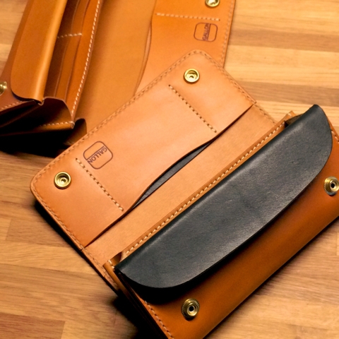 ツートンカラーのガゼットロングウォレット。 ベースはキャメルで製作し、カードポケットと小銭入れのフラップのみをブラックで組み合わせております。2箇所だけのツートンですが、奥の通常モデルと比べるとガラッと雰囲気が変わります。 財布を閉じると通常のカラーリングと全く見分けがつかないという、さりげない配色です。 ご予約いただいた方にのみ製作している別注カラーですので、ご希望の方はお問い合わせ下さい。写真とは逆の配色で、ブラックベースにキャメルの指し色で...