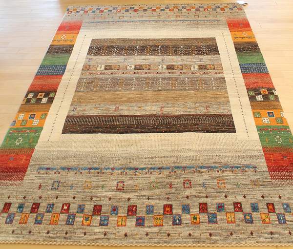 JUGEMテーマ:おすすめインテリア・雑貨 こんにちは、事務スタッフの山本です 以前から何度かギャッベについての織り目、 そして色やモチーフの紹介をしてきましたが、 これを踏まえて! ギャッベを見てみると、どうでしょうか? こちらは、 当社スタッフもお気に入りの、一枚 優しい原毛色のボーダーが リラックス感を、 周りを囲むビタミンカラーが 華やかさを演出してくれるギャッベです。 中央のモチーフにはたくさんの「生命の樹」、 そしてその樹々に囲まれるように 子供や羊...