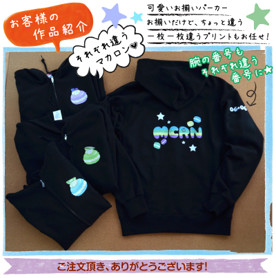 JUGEMテーマ:オリジナル作製ドリームプリントSKのTシャツ日記 こんにちは あっという間に3月 春だ〜 と言うには気が早く・・・ 今日の四日市は雪です 気温差に花粉にインフルエンザに風邪に多忙に・・・ 体調崩す〜 皆も気力で元気に過ごしましょう 気力が必要なんはワタクシの話か・・・ 頑張るもん元気モリモリ さて、今日は と〜っても可愛いお揃いオリジナルパーカーをご紹介します 胸のマカロンがそれぞれ違う可愛いマカロンなんです で〜、腕の番号もそれぞれ違う 可愛いですね〜 こんな感じでお揃...