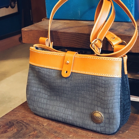 レザーサコッシュのグレー×キャメルに、マチを取り付けたタイプのオーダー。 マチ部分のカラーや素材はお任せいただきました。