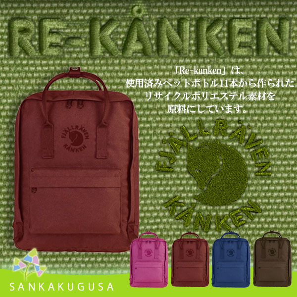 JUGEMテーマ:バッグ Re-kanken」は使用済みペットボトル11本から作られたリサイクルポリエステル素材を原料にしています。 さらに「SpinDye」という革新的な染色方法で1本の色から染めています。 この染色方法は化学薬品・水・エネルギーを低減した環境にやさしい技術。 人と野生動物と自然環境に配慮した商品作りを基本としたフェールラーベンならではのNEWモデルです。 Re-Kanken フェールラーベン リカンケン バッグ ↓↓↓↓↓↓