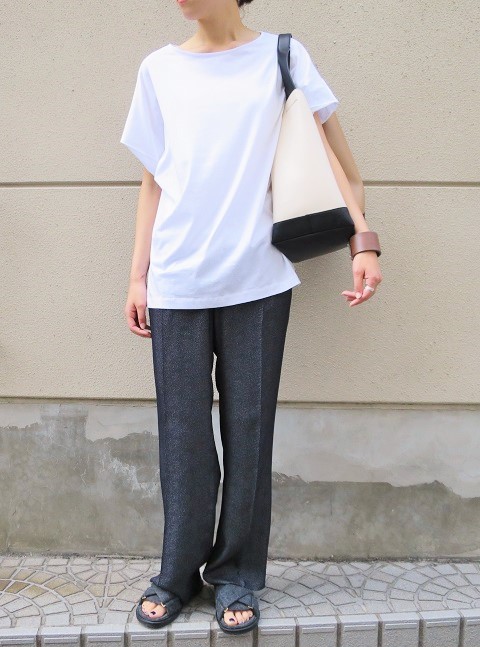 JUGEMテーマ:ファッション JUGEMテーマ:バッグ お知らせ 明日8月13日(木)は店休させていただきます。 ご来店予定だった方にはご迷惑をおかけしますがご了承下さい。 お盆時期で帰省の方も多く感じられます。 まだまだ気温の高い8月ですが、朝晩の涼しい風に影響され少しずつ秋物が気になり出す頃。 続々と新作が入荷しています。 今年はワイドパンツがトレンドで既にお持ちの方も多いはず... そんなワイドパンツにピッタリなTシャツが「DEMYLEE(デミリー)」から入荷...