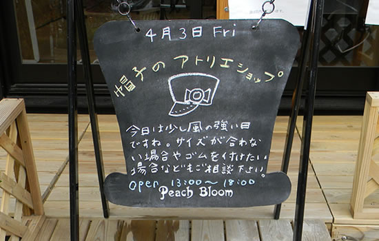 「4/3 金曜日 アトリエショップ営業日です」 本日アトリエショップの営業日です。 今日は少し風の強い日です。 サイズが合わない場合やゴムを付けたい場合なども ご相談下さい。 本日も営業時間は13時から18時です。 皆様のお越しをお待ちしています。