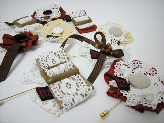 PeachBloomの入澤です。 出来ましたよー。ノベルティのハットピン。 レースを使っているものが多いです。デザイン全部違います。 12960円以上お買い物された方先着10名様です。選んでねー。 ------------------- 4月8日(水)〜4月14日(火) ピーチブルーム帽子フェア 銀座三越 1F 帽子売り場 営業時間: 10:30〜20:00