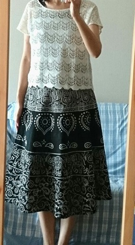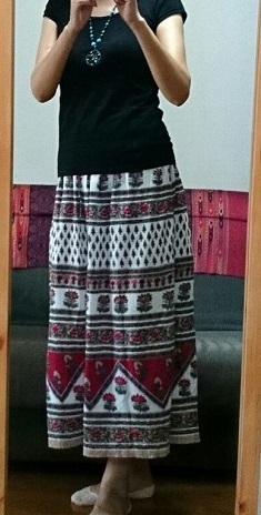 ふくらはぎの下くらいの長さで、巻きスカート風のウエストゴムスカート。 ちょっとバティックを巻いたような感じに見える。 お気に入り。だいぶ洗ったので黒の部分が少し白茶けてきている。 素材:コットン 入手:2011年ごろ JUGEMテーマ:エスニック&アジアン